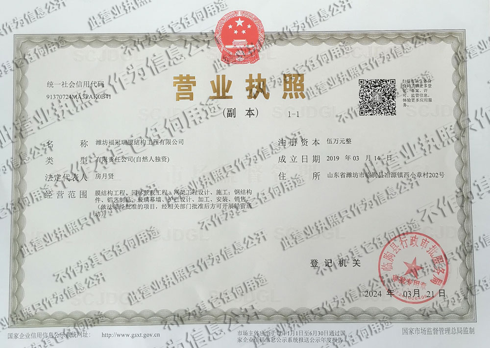潍坊福冠瑞膜结构工程有限公司是一家集膜材加工,销售及索膜结构,异型钢结构的规划、设计、理论分析、结构计算、加工制作、施工安装和维护管理于一体的技术工程公司。 本公司开发的...
